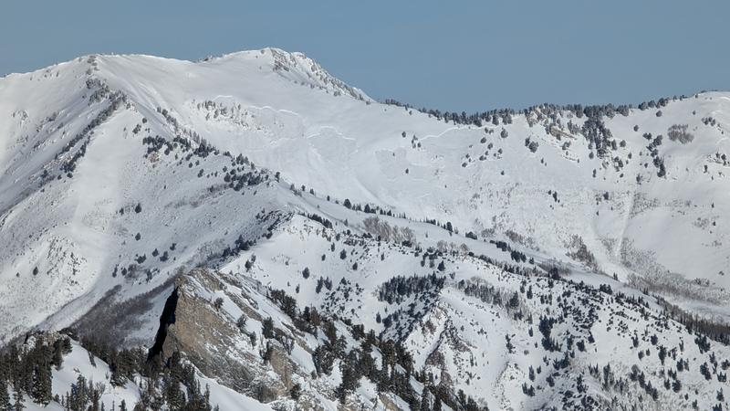 Widespread large slides on the S/SE facing aspect of Butler Basin, on the south slopes of Gobblers Knob, Wilson Peak, and heading east (looker's right) toward Soldier Peak.