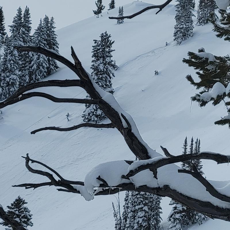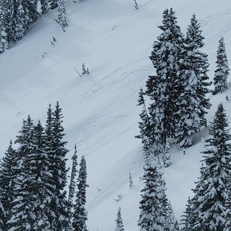 It looks, from lower on the ridge, to have potentially been a small soft slab triggered by a tree bomb. It then ran a couple hundred feet blending into what looks like older avy debris. Pitcured first is the crown and then the debris