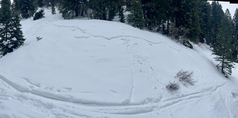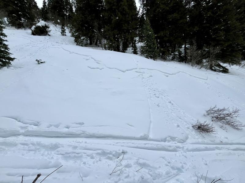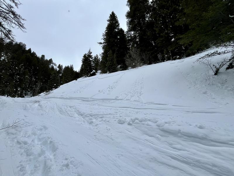 This is an old avalanche most likely occurred on 1/17 during high PI rates based on similar known crown lines in the area. This avalanche broke very wide just above the Butler Fork skintrack, less than 5 minutes from the parking lot.