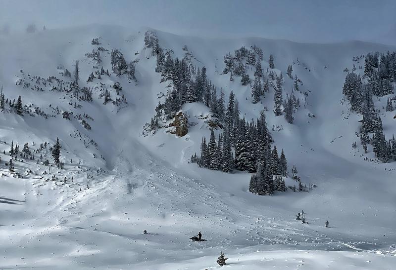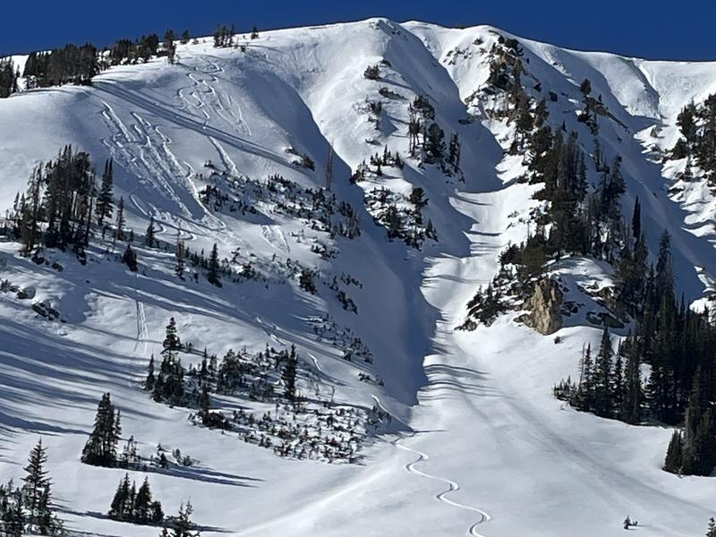It looks like parts of this face avalanched at two different times. The looker's right chute had old debris under it. The left chute and face has slightly fresher debris and it probably avalanched the same time as Double Hill.