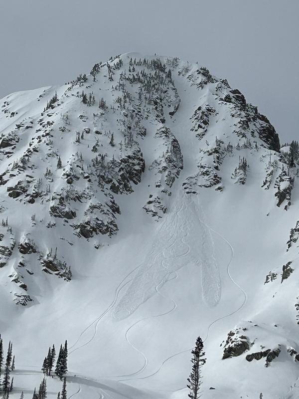 Once I was off the line and looked back. I could finally see how far the slab and sluff had ran. Running about 600-700' in vert and deep into the apron below in 2 prounced fans.