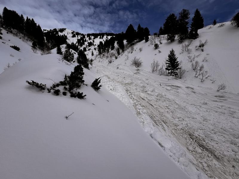 It ran about 1,800' vertical. Thinking D size 2.5. The debris was very difficult to move through. Very much wet debris with large blocks and chunky dense snow, but still unsure of what was happening up in the start zone. In spots the debris seemed to easily be 5m deep on average and was about 1 acre in area.