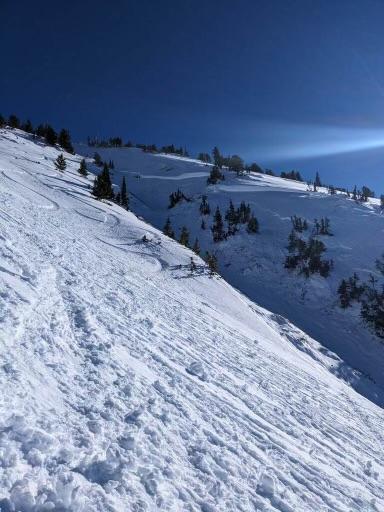 3 skiers approached gobblers south summit (10224) from the north. After reaching the summit, skier 1 skied the ridge to the west of davis gulch and radioed when they were in a good spot. Skier 2 entered davis gulch and skied 400 vert pulling out of the run to the north/east. Skier 3 watched skier 2 pull up and entered following the same line. 200 vert into the run, skier 3 caused a hard slab avalanche that shattered 50 meters below and over to the ridge west of davis gulch. Skier 2 shouted at skier 3 and then to skier 1. Skier 1 moved to a safer area. Skier 2 kept eyes on skier 3 and started to ski down the slope. Skier 3 was carried 650 vert reaching a speed of 27mph, losing a pole and needing to dig out one ski to be free from the debris. After the initial avalanche, the entire west side of the gulch sympathetically released. The final debris pile was way down around 7800 feet.