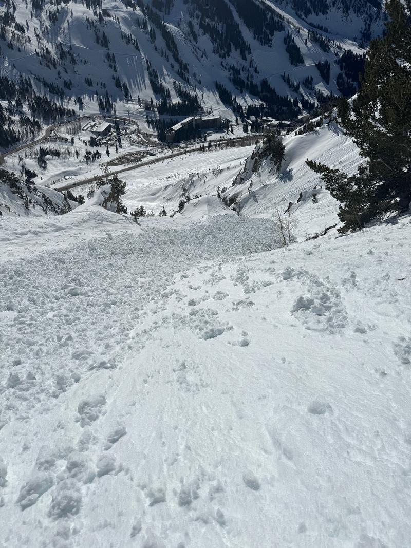 The debris pile would have been more than enough to bury or injure a rider (D2) if they were not able to get out of the way. This wet avalanche gouged out walls 2-3' deep on either side of the gully feature before piling up in a bowl shaped feature. There was not enough snow to push out onto the apron and a smaller section of debris (D1) was visible in the chute to the west. The primary aspect on this avalanche was southerly however the walls would have allowed for more heating during the afternoon when the westerly facing sun would have been stronger.