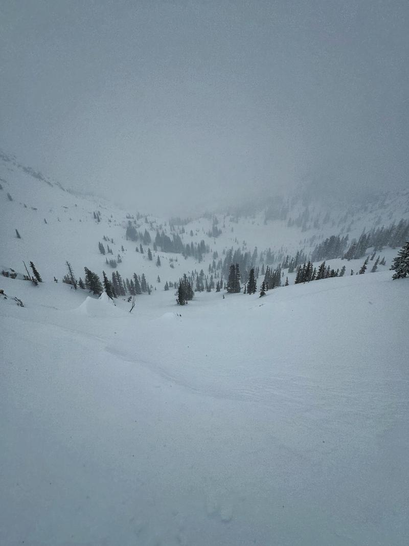 Side cut the left side of the small meadow and noticed a small 6" deep movement. Went to the right side of the meadow and did the same side cut with no reactions. Looked pretty wind loaded at the top of the run but mellowed out more ~20 yards down. First turn into the run the whole little section ran pretty much the length of the run.