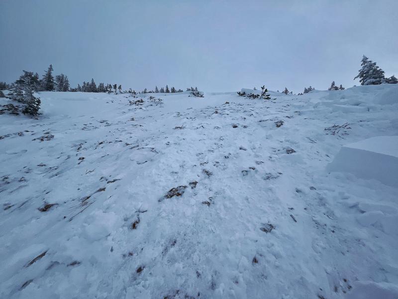 Two ski patrollers were approaching this slope because it is a common slope that gets loaded by south winds. As they approached the slope, they triggered a collapse and remotely triggered it. Red circle shows them after the avalanche released near the trigger point.