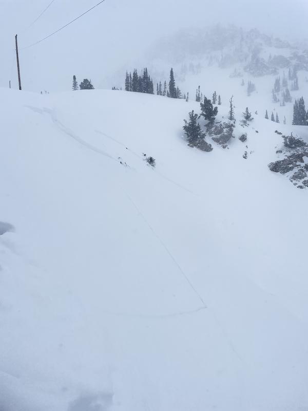SS-ASr/c-D1-R2.5 9,500' ENE. Intentional remote trigger of new, very soft, wind slab. Ran far and fast for the size of slope. Happened in the small bowl heading up to pole line pass. Greater than about 35* slope needed to move, cracked and arrested in areas where slope was less than about 35*. Poor picture below .