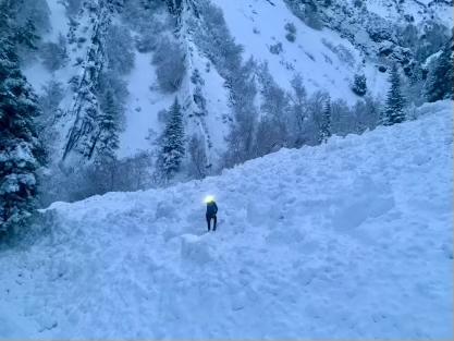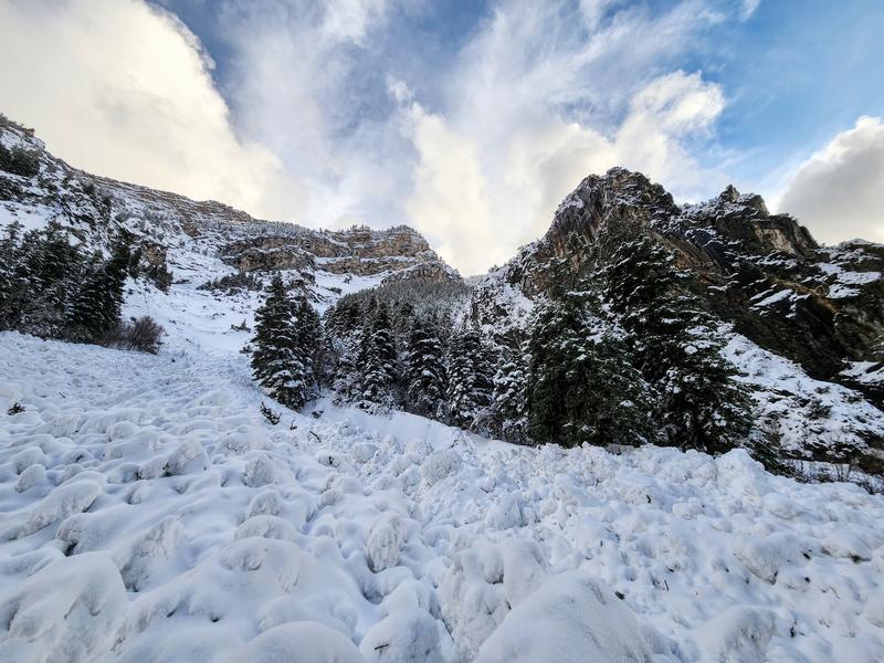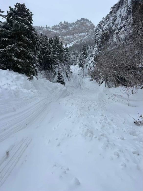 A large avalanche completely covered the Provo Rock Canyon trail on Feb 7, 2024. This ocurred on a large, partially barren (smooth rock) north-facing slope just above the second bridge. The debris field from this slide extended down-canyon, completely covering the second bridge with a wall of snow over 20 feet high. Avalanches in Rock Canyon are uncommon.
