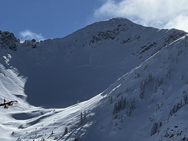 Just submitting a couple photos of a big avalanche in Mineral Fork (Big Cottonwood) at the head of the drainage in the Room of Doom. The photo is from quite a distance, but there is a large crown visible. I didn't attempt any estimates of size, depth, etc., but you can see it was very large. There was a lot of debris off of Santiago Ridge, soft slabs or big sluffs that ran far and wide. They all appeared to have about 10-12" of new snow on top of the debris and the debris in the Room of Doom looked similar (from a distance). Based on the snowfall observations the past few days, it would seem all these slides were part of natural cycle late Wednesday or sometime on Thursday.