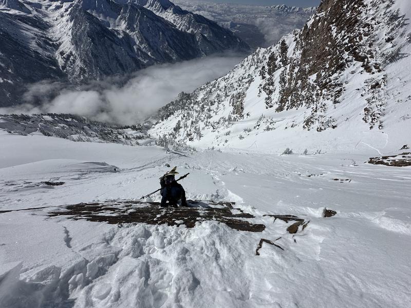 From the East Ridge of BF Twins, we watched a solo skier get caught, carried, and injured in a serious avalanche into south-facing terrain in between Lisa Falls and Jepson's Folley. This skier followed the track that our group of three set to the col between Sunrise Peak and BF Twins, but never initiated a conversation with us to determine how our plans and theirs lined up. As we were boot-packing up the lower east ridge, this skier traversed below us in the start zone of this path into a small couloir, where they were caught and carried in a small avalanche. They continued skinning up the couloir after this and went out of sight as we continued up the ridge. As we neared the intersection of the couloir and the ridge, we noticed a pillow of wind drifted snow at the top of the couloir. Soon thereafter, this slab released on the skier skinning up the couloir. While we couldn't see the skier at the time of the avalanche, we moved to a viewpoint where we could see the whole path, and they were not visible. At this point, one skier from our group continued to a lower viewpoint on the bed surface lower down where they made voice and visual contact with the skier in the avalanche, who requested help.