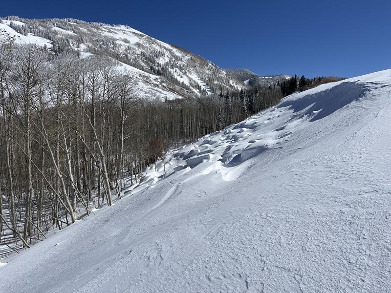 Observed on the far north edge of a large open area that fetches typical SW winds. 38 degree start zone into 30 degree apron. Ran in large blocks that hit the edge of aspen stand. Some rounding and snow filling on debris blocks, so I assume it ran sometime during the Feb 6-10 stormy period.