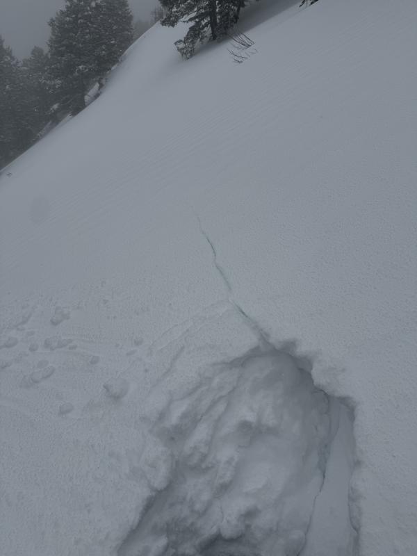 The new/old interface was reactive today, more so with slabs than sluffs. Cracking was not widespread while skinning up as the crust that was present about 6-10" down was inconsistent depending on tree coverage and aspect changes. Hand pits were inconsistant as well. Some yielded slab formation with graupel present while others mimicked the makings of a powder day. On a test slope on the way up I did get some good cracking with a small jump and I have linked that below.