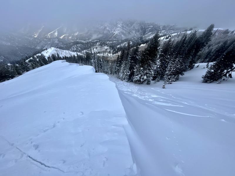 Observed 2 small (SS-NC-R1-D1) avalanches on ridgetop today that illustrate my main current concern. Light-Moderate SW winds throughout the last 12 hours accompanied by 6-13"(elevation dependent) medium-density snow created soft windslabs isolated to ridgetops & exposed terrain features. These pieces likely ran naturally from cornice fall during the height of PI mid-morning today. The first photo shows an full-cornice crack multiple feet back from the edge, a good reminder to keep the cornice root location in mind. This ridge has a number of NNE areas that load from SW wind and this is a good indicator slope for slab sensitivity/propagation. Other pieces here had run during the last cycle and were more obscured by today's snow.