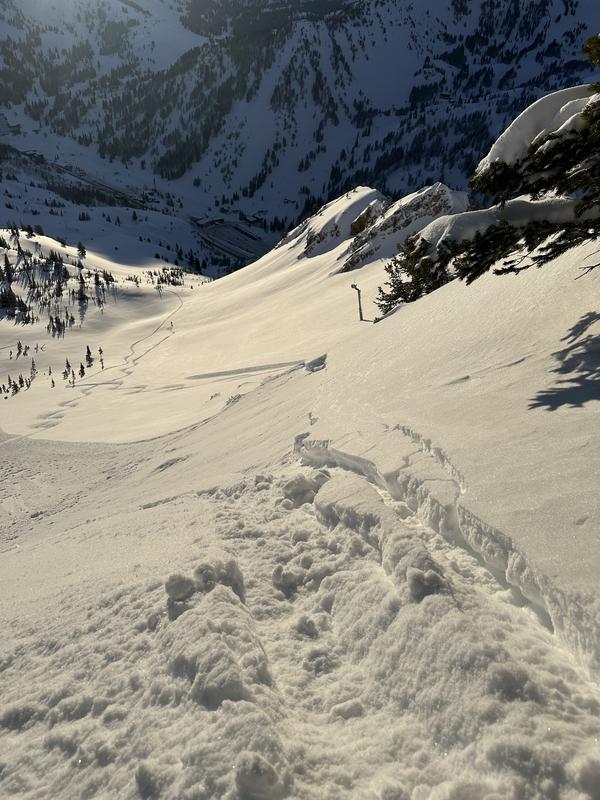 When my partner dropped in, a soft slab broke about 25 feet wide and 6 inches deep. This was Friday evening's snow that broke and slid off Thursday morning/daytime snow. The slide ran down the entirety of the face. The layer was very light snow and wasn't deep enough to cause any concern of catching/carrying/burying.