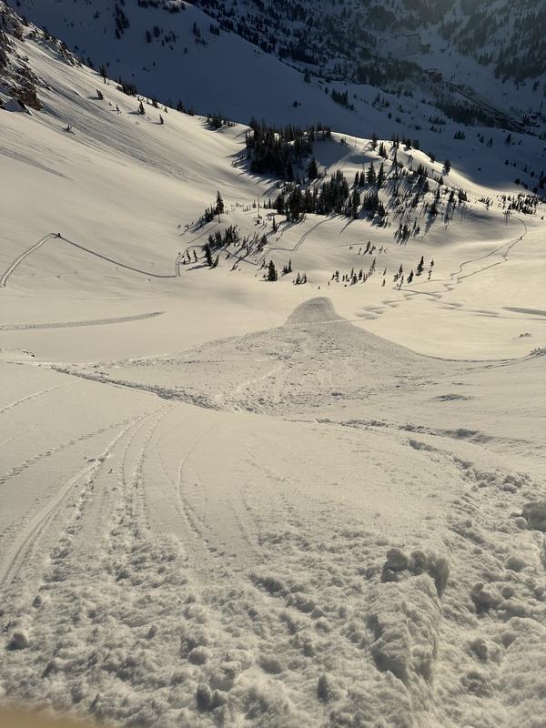 Saturday around 7:45am, myself and a friend dropped in on the east face of Cardiff Bowl (LCC), down the ridge northeast from the peak. On the way up, we saw one skier not in our group drop in a little higher on the ridge, which brought down a little sluff from the new snow.