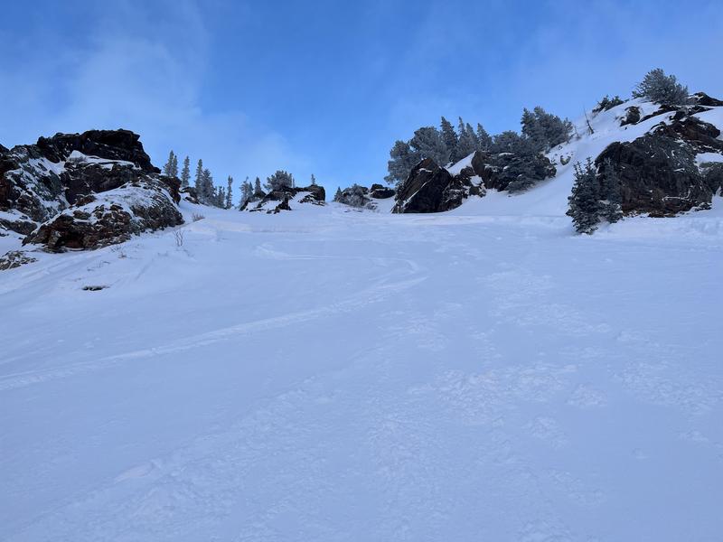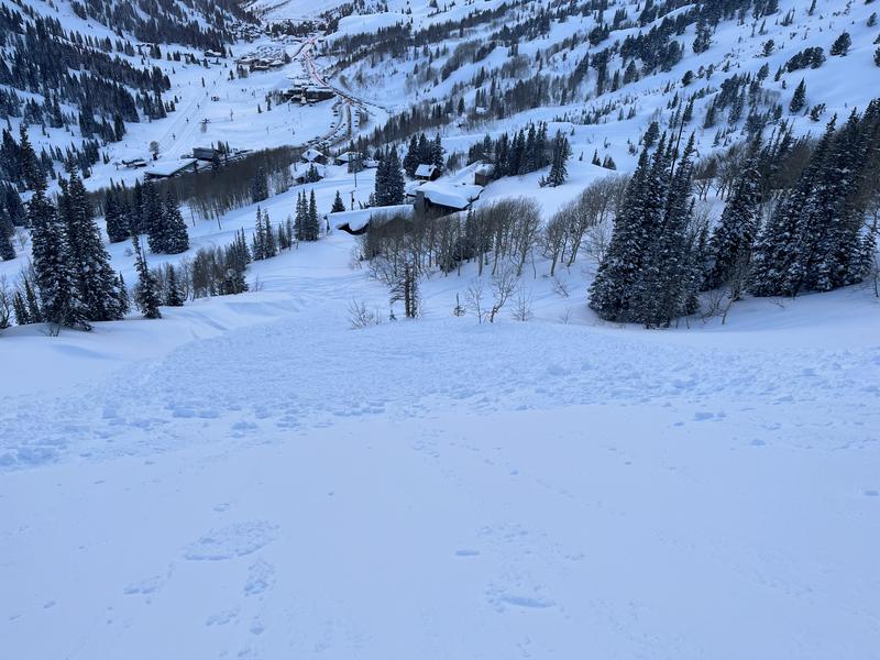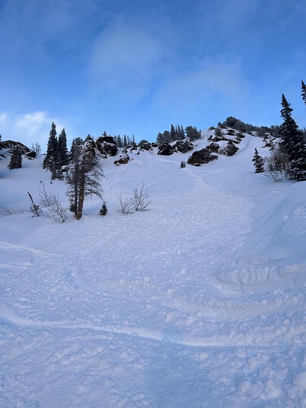 One skier caught. No injuries, nobody carried or buried. This avalanche broke as a slab 1-2' deep, 100-200' wide, and ran for about 250'. From what we could tell, the slab failed on a weak interface between the new and old snow. It was fairly deep and firm in some areas due to wind affect. This slab happened to break about 15' above the skier and propagated quite far in all directions, especially down slope. West aspect 260°.