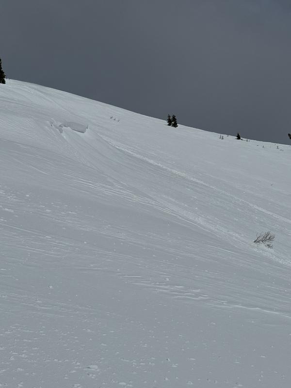 Beautiful day in the mountains. Headed out in a group of 4. Skied a run on little water, a few laps on toms, and then headed up to Reynolds. We had a lot of westerly wind on top, which made us feel more confident about skiing the east face. We debated back and forth and ended up skiing the first part of the face and then making our way over to the ridge on the skiers right. There were a few drifts of cross loaded snow on the north side of the ridge, one of which broke off about 40 feet in front of the first skier and caused an avalanche that slid down around 500 vertical feet. The debris didn't look that deep, maybe 2 feet at most, but since there were a few more drifts, we skied the ridge down and never got a great angle to capture a great picture of the avalanche.