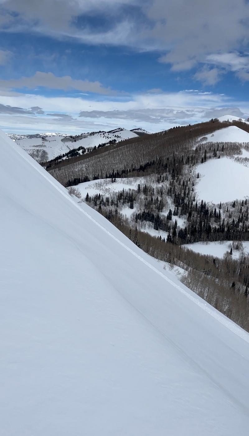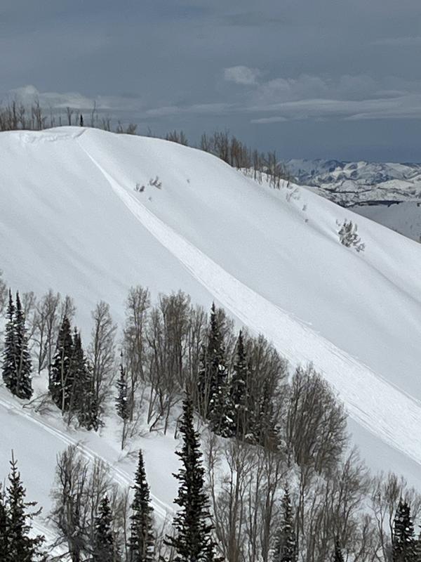 Watched this loose wet movement happen naturally at 12:00 pm on far skiers left side of Reynold East Face. Started with a tiny (softball size) break-off, but picked up a decent amount of wet snow along the way, running about 600' or so. Walked over the look at it and it didn't have much depth/height to it (see side profile picture).
