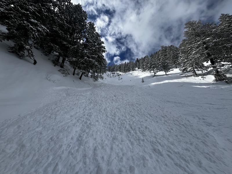 About 1/2 - 2/3 of the way down Inbetween, some sluffs from the east facing wall had entrained into a long running loose avalanche in the gut. Not sure how high up in the trees the starting points were (there were multiple). The slide joined the Inbetween run at the choke just under the cliffs mid run and stopped a few hundred feet short of where the run ends. Debris pile was deep, and in some spots quite chunky. Did a beacon search of the debris, no signals. No tracks. Must have been natural, and likely late at night/early this morning due to the lack of new snow. Surprisingly big. I suppose all that graupel had something to do with it.