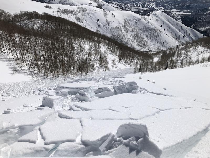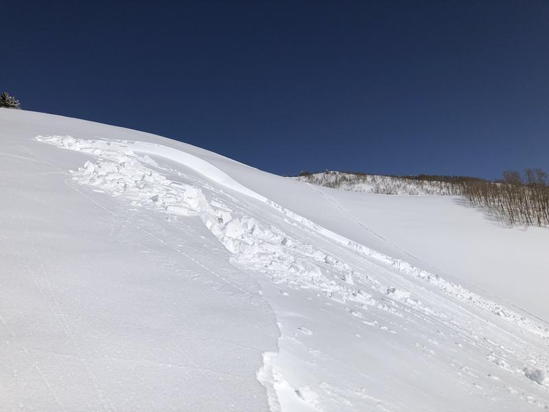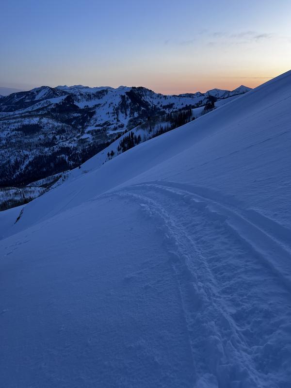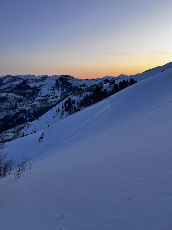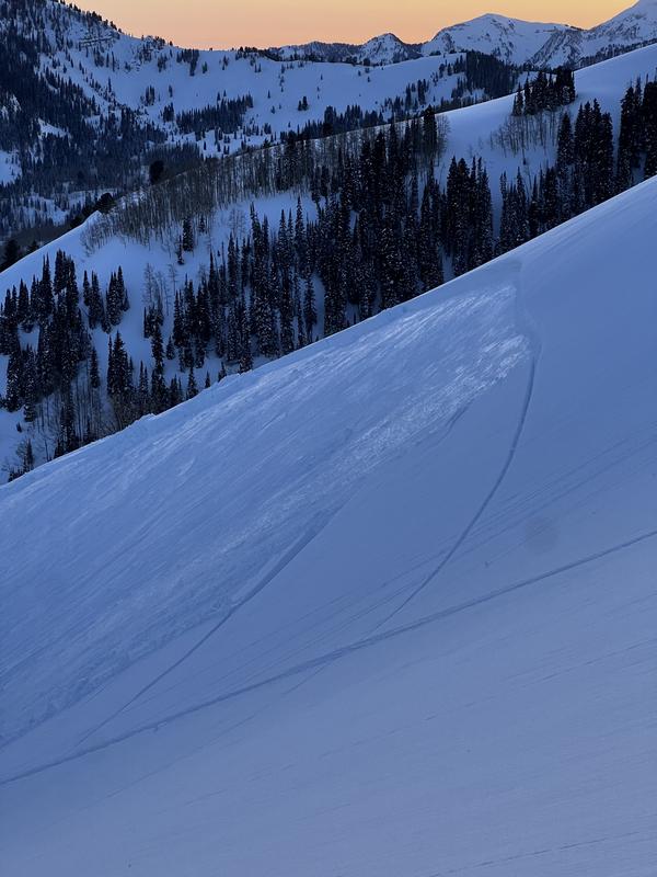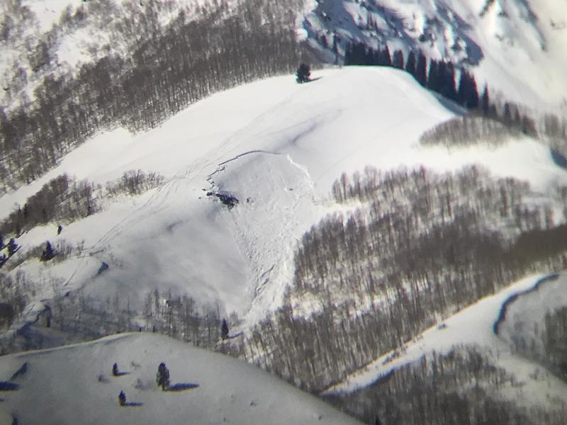 Snowmobile tracks in and out of the area. This slide was just below a common track into Caribou Basin from "Cornice 2". Multiple snowmobile and timber sled tracks surrounding this area. Slide path appears very "shiny" even at sunset. No beacon signal reported, so assuming any buried persons were recovered. All similar aspects in and around this area have signs of avalanche (4 visible from miles away), whether natural or human triggered, this is an extensive snowmobile/sled skiing area.