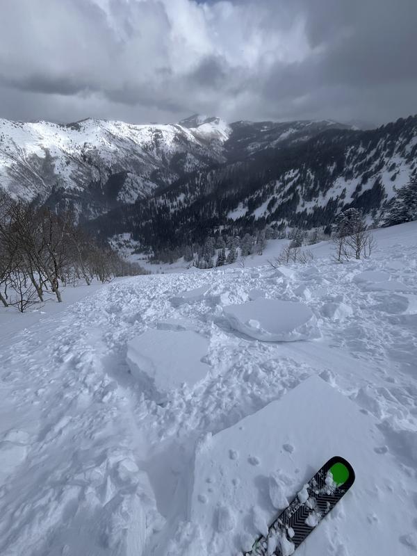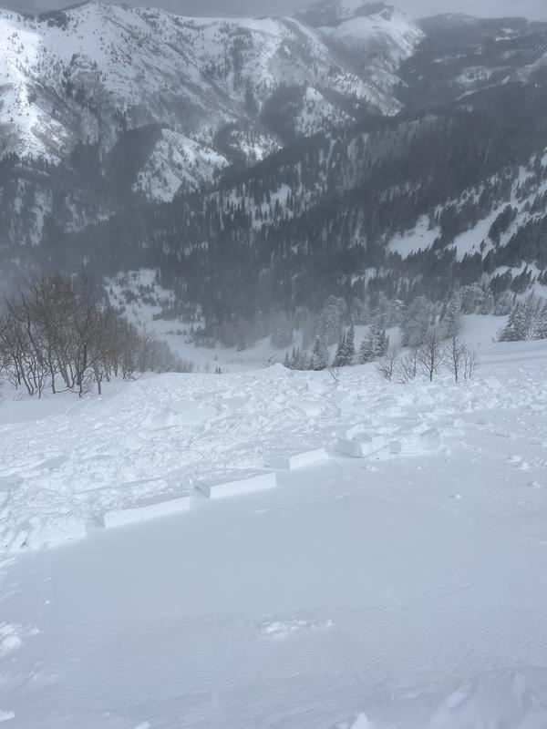 We observed natural cornice activity but were surprised the slope was intact still. We found a nice test slope above a bench far skiers left to see how the new snow was settling. A small cornice triggered a 4-6 inch wind slab that broke a deeper slab which propagated across the entire slope. When the slab broke it entrained a lot of new snow with an impressive powder cloud reaching the flats of Alexander Basin. The connectivity was quite shocking, this was forecast moderate terrain but acted like high danger.