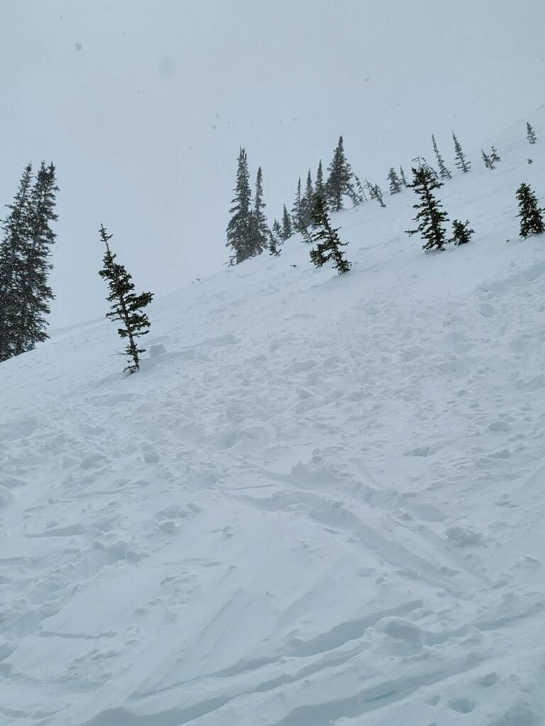 Picture shows the crack running up onto the slope about where we were standing. We were not standing on a cornice but unfortunately, the sudden collapse of shallow snow underneath us sent the group onto the downhill side of the shoulder and onto the northeast aspect of the ridge before anyone could retreat. Skier 1 slid for about 140 yards and Skier 2 slid for about 120 yards. Skier 2 was about 15 feet behind skier 1 when the slide was triggered. Skier 3 and Skier 4 were behind us. No one was completely buried. Skier 1 lost a ski and pole and skier 2 lost a pole.