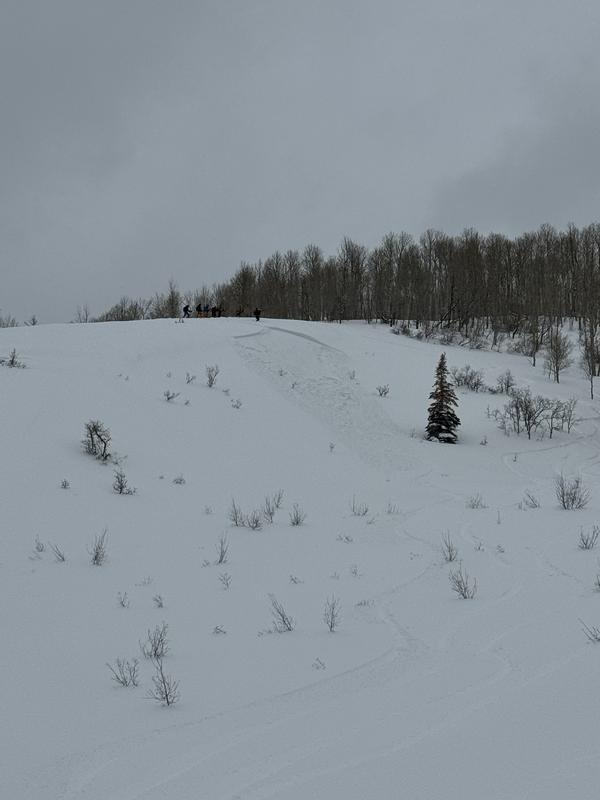 Soft slab with a little bit of wind load on the SE aspect in exposed terrain in Beartrap. Triggered by the first rider of the group at the 38° roll on a small terrain feature. Flanks did not crack with other riders coming down. We did not check for the presence of graupel at the N/O interface but found it in hand pits throughout the day so it was likely present and contributed to this slab.