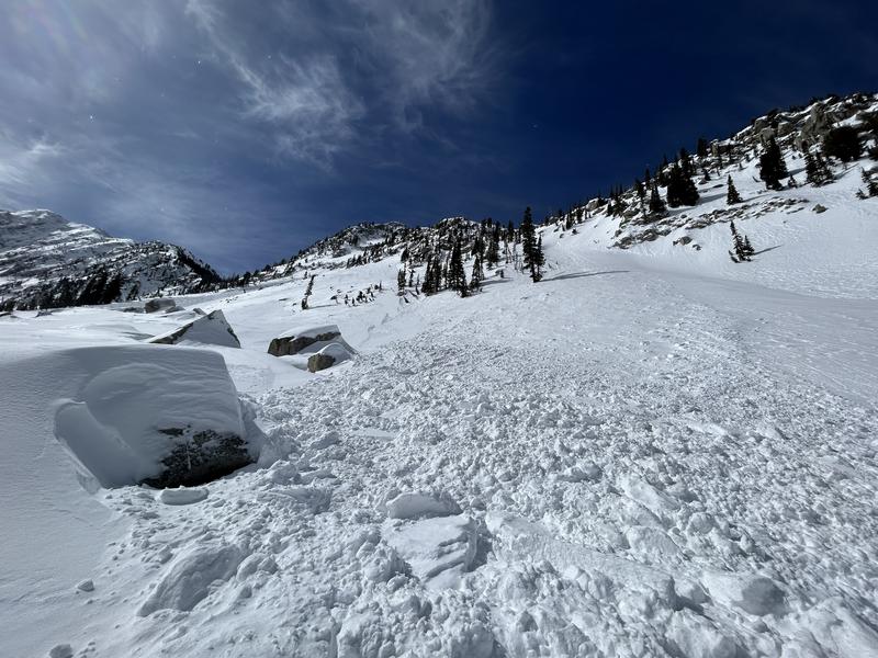 While near the top of the slope (about 100 vertical feet below the ridgeline) my partner who was ahead of me triggered a hard slab avalanche about 1-2 feet thick. He was briefly caught on top of the hard debris but was able to quickly escape by skiing off to the side. We had been tracking softer, 4-6 inch wind slabs on the way up, however they seemed well-bonded and not hollow. This avalanche stepped down to a deeper interface and propagated surprisingly far. My partner lost both of his poles (we found one while skiing down the bed surface) but we were both unscathed (I was off to the side when the avalanche was triggered.) The debris field was likely not deep enough to bury a person but the avalanche ran through some trees and small rock bands and would have likely caused injury if one of us were caught and carried. We skied back down the bed surface and bailed on any further ski objectives.