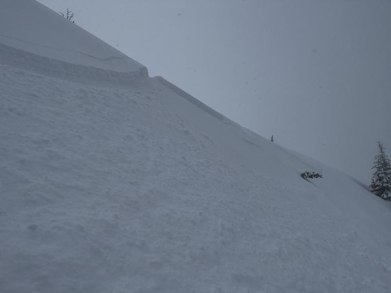 Wind/storm slab triggered by ski cut. Seemed to run on change in storm snow density. Saw evidence of snow transport on ridgeline. Probably ran 250 ft downhill. Would've been a serious problem in more complex terrain.
