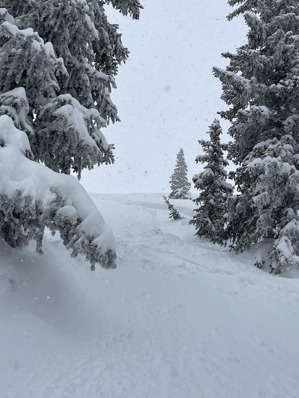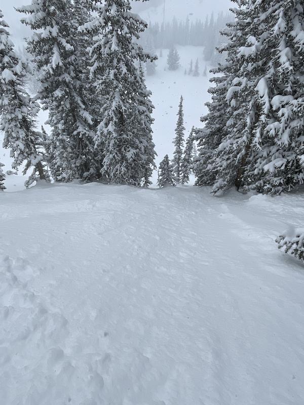 Our group of 4 toured up Grizzly Gulch around 9an, primarily sticking to the trees on the North aspect of the Patsy ridge line. We eventually edged further up the ridge (East) into a few of the steeper lines, noting the fairly reactive sluff we'd encountered throughout day from the new storm snow. It was snowing pretty hard on and off all day with variable wind as well. On one of the steeper drops, I triggered a big sluff and rode over to a safe zone to let it pass. When looking back up the hill, we noticed a 6-8" crown about 20" wide. The sluff was moving pretty fast, but since it was a pretty narrow crown and not a ton of snow moving, it was easy enough to ride out of. Given our location and the short pitches we were riding it wasn't a huge concern, but would definitely be something to watch out for in more consequential terrain. It hadn't let up snowing when we left the parking lot around 3pm and is worth noting that the sluff became more reactive throughout the day with the added snow (thank you lake effect). I didn't hike back up to the crown to check, but I would assume it slid on the old / new snow interface.