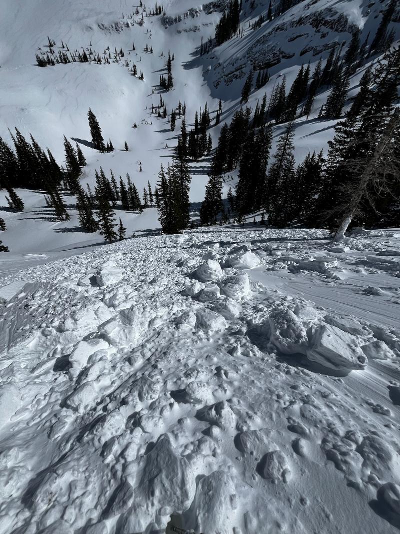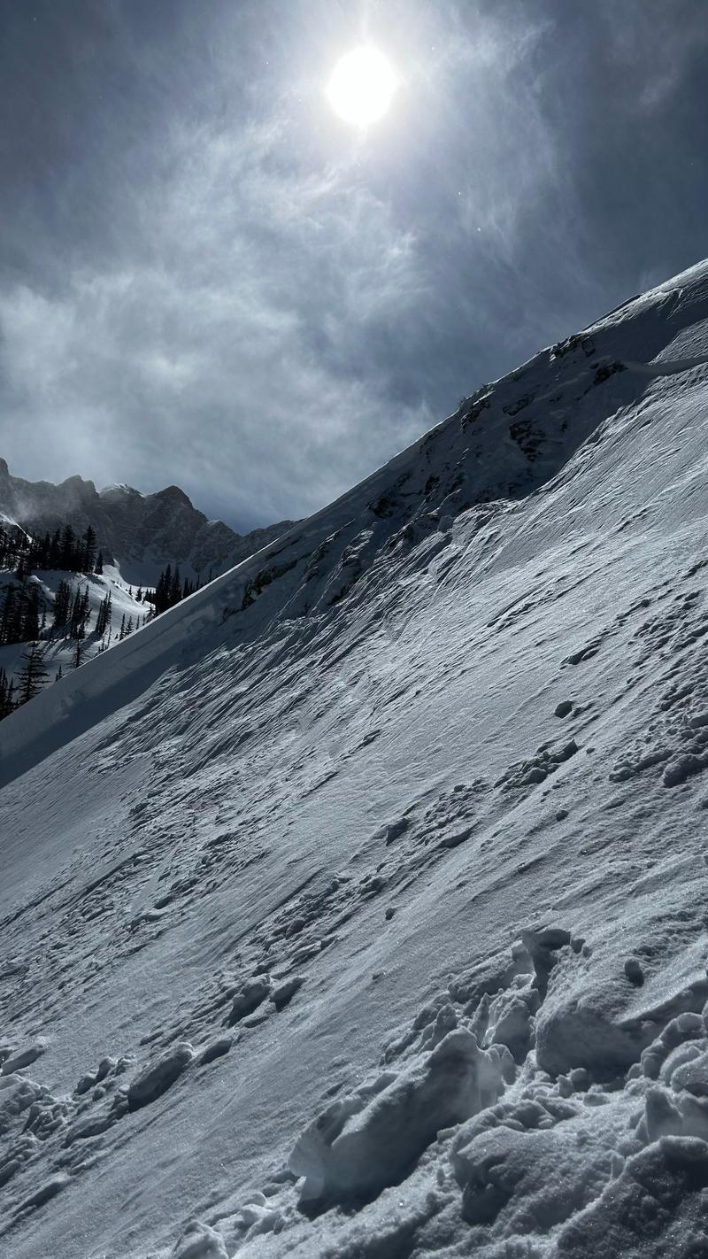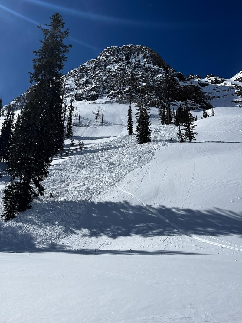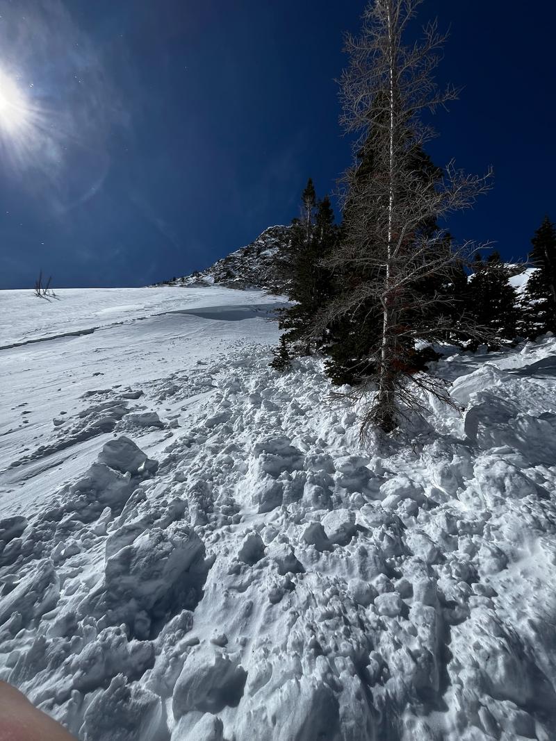 Heavy wind loading for this East facing aspect. This was a combination of a sunbaked facet, wind, and warming temperatures. We had one individual get carried a couple feet but everyone came out scotch free. The crown had a maximum size of 15 inches and minimum of 2-3inches. The slide went down about 300 feet before slowly stopping at the bottom near the skin track. There were similar smaller sluffs in this area that triggered naturally.