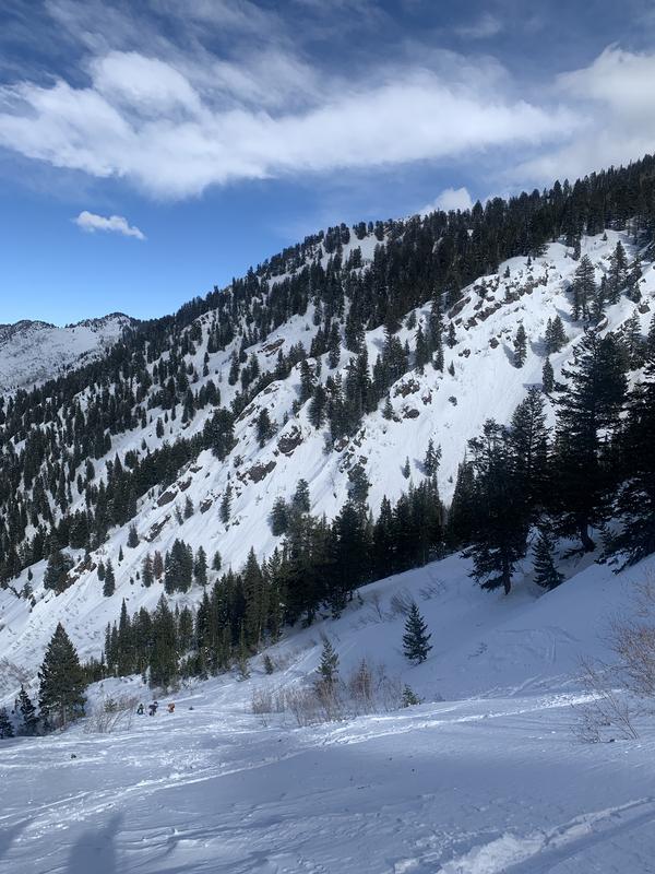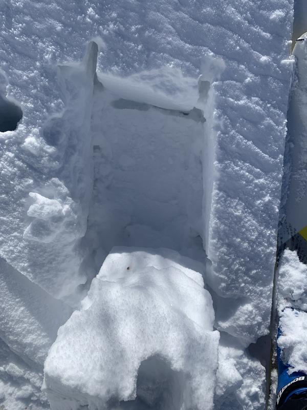 Skinning up Norths Fork and Memorial Chutes, we encountered many types of wind affected snow--crusts of varying thickness, pockets of soft snow, and some small drifts. I dug a hasty pit in a small pocket of a slab that failed as I cut the top of the pit with my pole. It appeared to be 5-10 cm of wind slab on top of what I presume was approximately 30 cm of recent new snowfall. The failure was on a layer of somewhat sparse graupel (see photo).