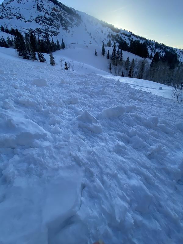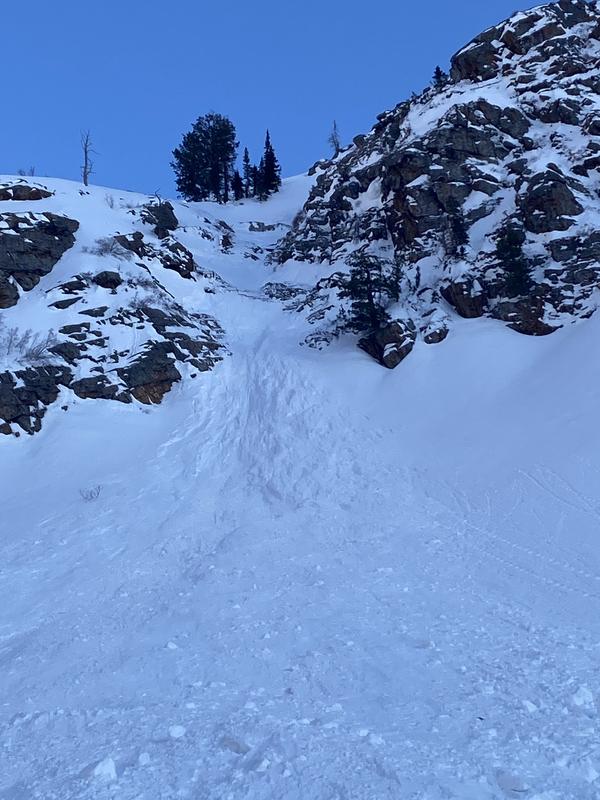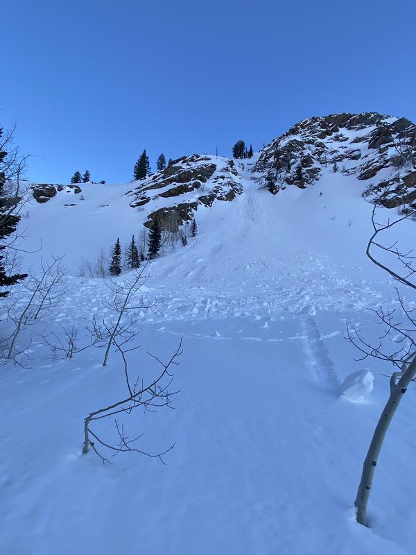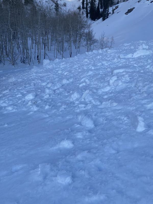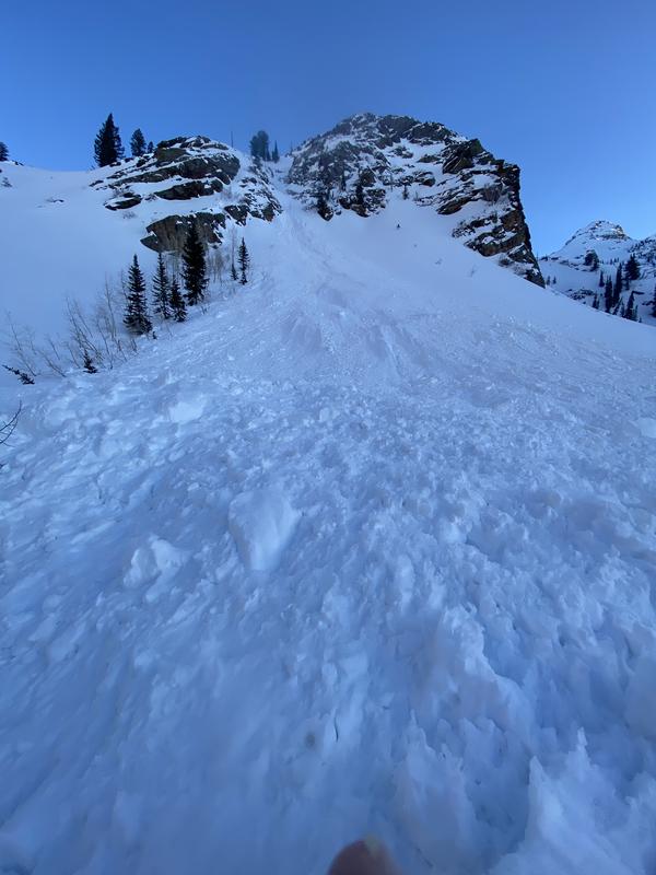 At its terminus, it appeared to be (see picture) 5 to 10 feet deep. This avy path doesn't run nearly as often as the one immediately adjacent to it and closer to the Blanche trail.