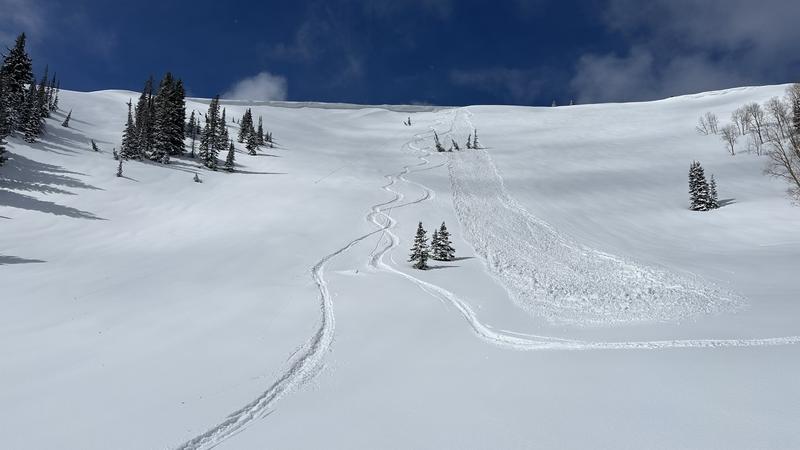 Ski cuts on 35ish degree E and SE aspects at ridge top produced slow moving dry loose. These ran in a density change in the new snow, likely caused by the occasional light winds on ridges. The sun came out intermittently for an hour or so around noon, and seemed to bond the new snow even further. Slope testing on our second lap produced a shorter running dry loose, with less snow being entrained. The new snow seemed to bond quite well to the old MF surface, and it was difficult to find trace of a slab in the terrain we skied.