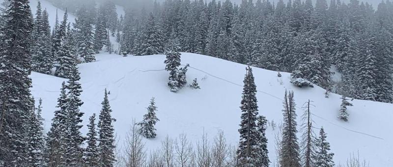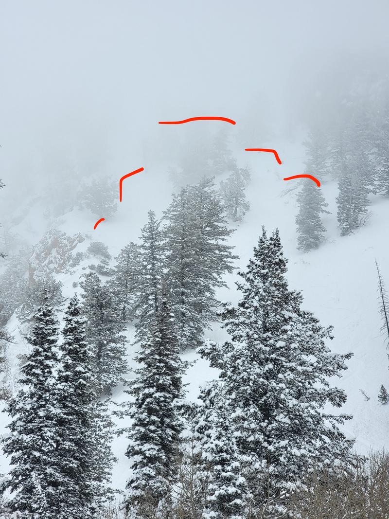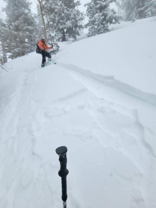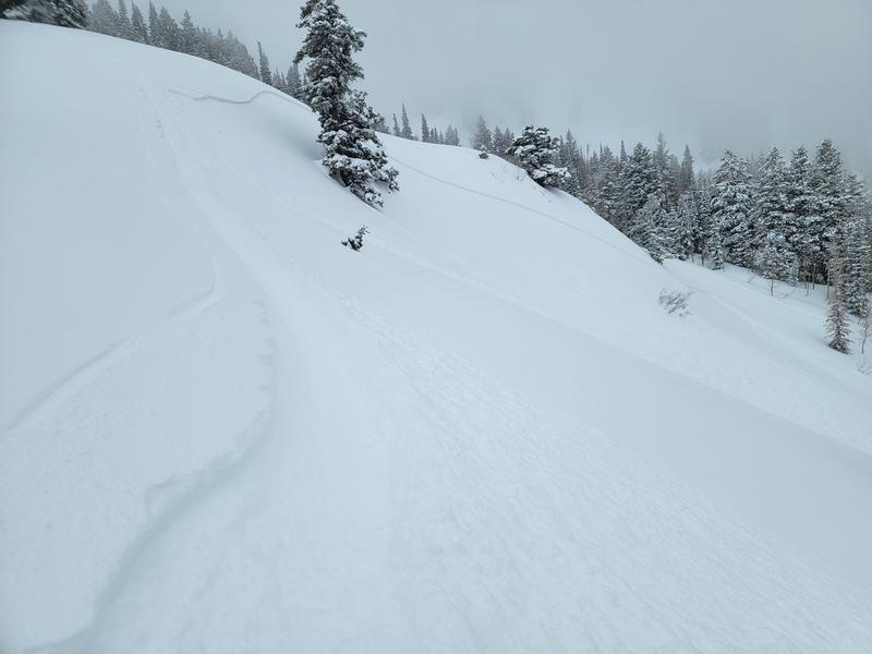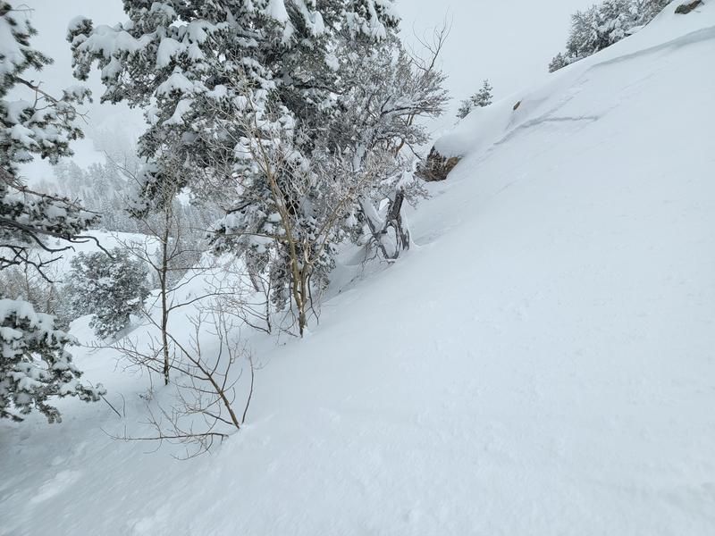 My partner and I started from the Neff's trailhead around 1000, reaching the aspen grove at 8000’ in Thomas Fork around 1300. On our way up, we noticed abundant natural activity in the top 2-5” of snow, appearing to run on a density inversion from colder, lighter snow overnight. Most if not all of the naturals observed were connected slabs. Between 1300 and 1400, PI picked up to 1-2”/h and maintained high rates until we topped out on Wildcat Peak around 1600. While breaking trail up the W-facing ramp to Wildcat, we remotely triggered a number of small terrain features on the same density inversion, with slides up to 6” deep. We noted that the activity was very sensitive to slope angle, with a tipping point around 35 degrees. Abundant cracking was also noted. Given the observed instability, we bailed on plans to ski any steeper lines and decided to take low-consequence terrain back down.