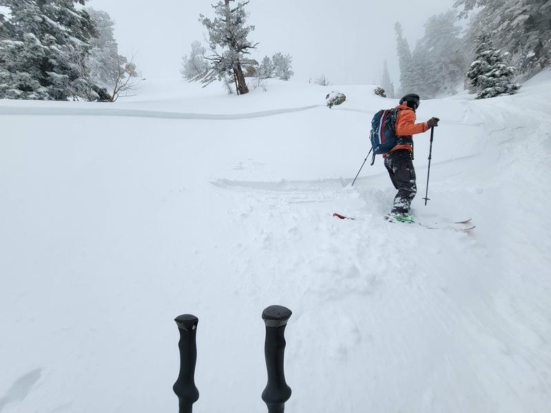 After regrouping at the bottom, we had one more rollover below us. We opted to ski the lower-angle shoulder skier’s right, but I did put a ski cut in above and right of the steeper (40+ degree) portion of the roll. This pulled out a 100-150’ wide, 6-10” deep slide which ran 150’ into the flats. While descending lower into Neff’s, pretty much every single terrain feature >35 degrees that we skied past slid 4-10” deep. All the slides ran on what appeared to be a low-density layer of stellars with a surprising amount of energy and connectivity. Wind was not a factor in most of the slides; this was a storm slab issue.