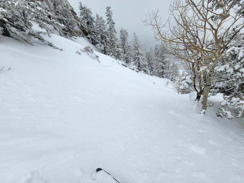 We skied the low-angle ramp together in great snow. At the bottom of the ramp, we worked slightly skier’s right towards a steeper rollover, which we were OK with skiing due to low consequence. We ended up further right than I intended, but I thought (based on a couple times I skied it last season) and it looked like the chute below us was wide and relatively short. We agreed to ski it one at a time and I dropped first. I wasn’t sufficiently careful or on guard and I carried too much speed over the rollover into the chute. I immediately realized that the terrain was steeper, more sustained, and higher-consequence than we’d planned on. Since I was already over the roll, I cut to the safest spot I could see, on a slight sub-ridge uphill of a tree. As I stopped, the slab broke 6-8’ above me 6-10” deep and 10-20’ wide. The crack propagated downhill of me and around some rocks to make the full slide 1-200’ wide. The slab was very soft and light and the snow didn’t get higher than boot-top as it washed past me; I wasn’t carried or pushed and didn’t even feel any real force on my skis. I radioed the situation to my partner, who skied to me. We then proceeded one at a time down the bed surface and debris, which generally didn’t seem deep enough to bury someone but could’ve been in spots. The slide ran 3-400’ vertical on a W aspect at 8500’.