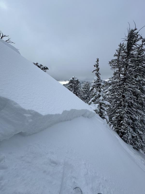 I noticed several small but somewhat deep crowns in the steep trees at the top of Argenta. Decided to perform a ski cut before dropping into an untracked line, sure enough triggered the same slab that seems to be problematic all over the Wasatch. Appeared to slide on a very small density change between the very dense snow from the beginning of the storm and the top 15".