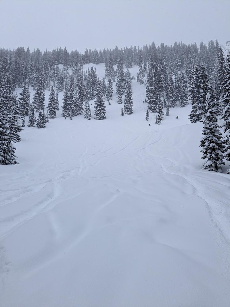 3" might not seem like much but with steep pitch n lots of bats, would have been a bad ride if carried and was bit surprised by depth of moving snow n speed. My original idea was to hit a slope/chute without baseball bats(there is only 1 on this ridge) but it was a bit far and I was late and nobody had made a track out there (fake time pressure). Trees made this a dumb place to mess with a thin slab. I will respect 3" weaknesses more.