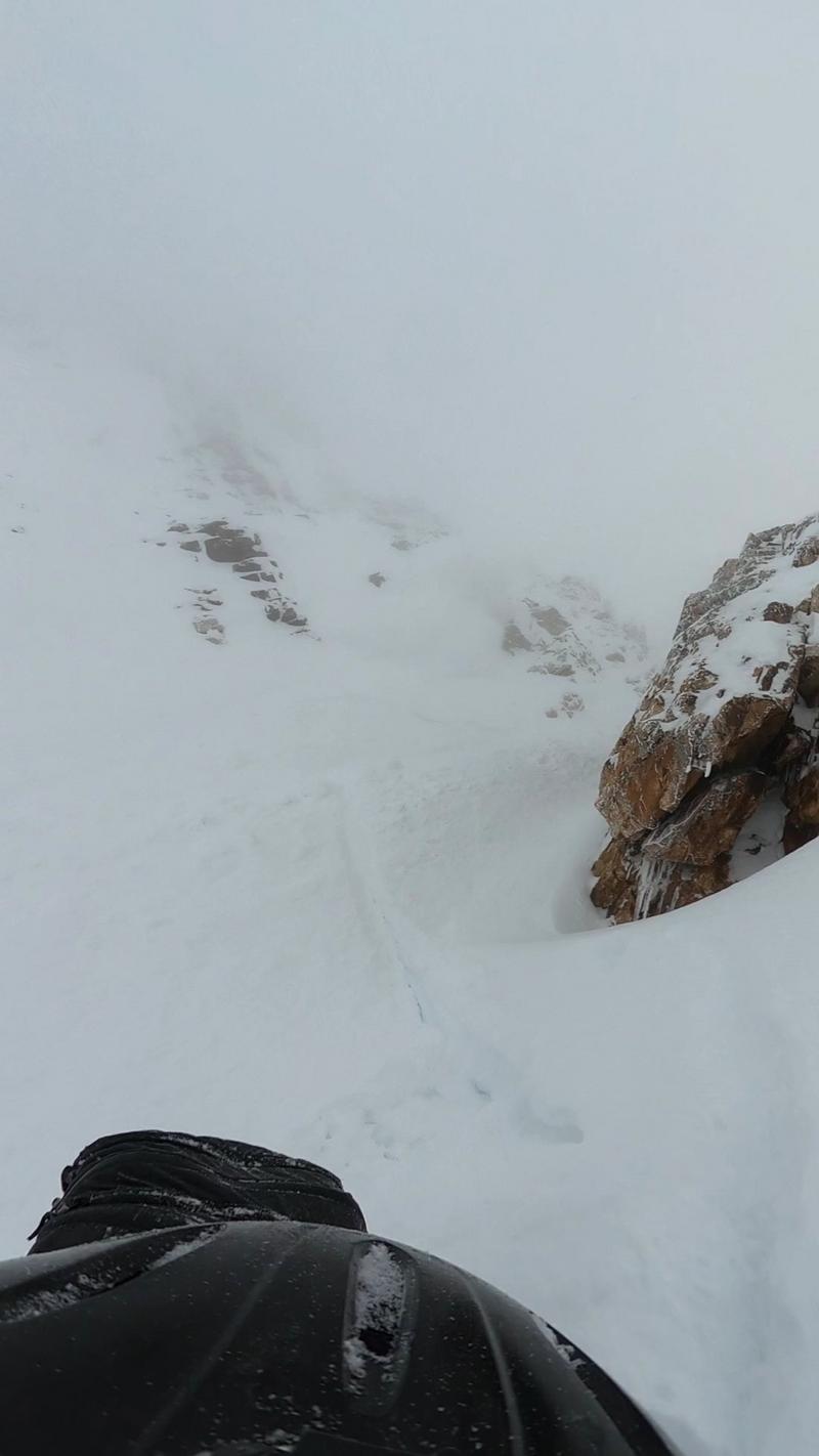 Visibility was not letting up and after about 20-30 min we saw that it was looking a bit better into the Monte Christo couloir and we would have rock walls to help with in there. Having done it 4 times in the past and knowing the traverse off to the side to avoid the rappel in it, we agreed to drop into it. All was fine as we worked our way down skiing a couple hundred feet at a time. A couple leap frogs in (at about 10500ft), I traversed to the skiiers left just out of the main slide path and radioed to my partner to come down to me. He skiied down to me, but within seconds after doing so and I mean seconds after going just past me, slightly further to my left, he yelled in distress as he saw a powder cloud coming down towards us. I had a split second to process, my turned away from the slide, before I felt a thump of slough against my back and on the tail of my board. I didn't realize it at the time, but the slide was a lot bigger than I had registered. We must have just gotten the side of it as the main of it flushed down the couloir and towards the cliffs of the rappel. Somehow we were able to keep our footing and not get swept. We were certain someone dropped in on us and so we belined skiiers left traversing further to get into Monte Christo Gully and out of there asap.