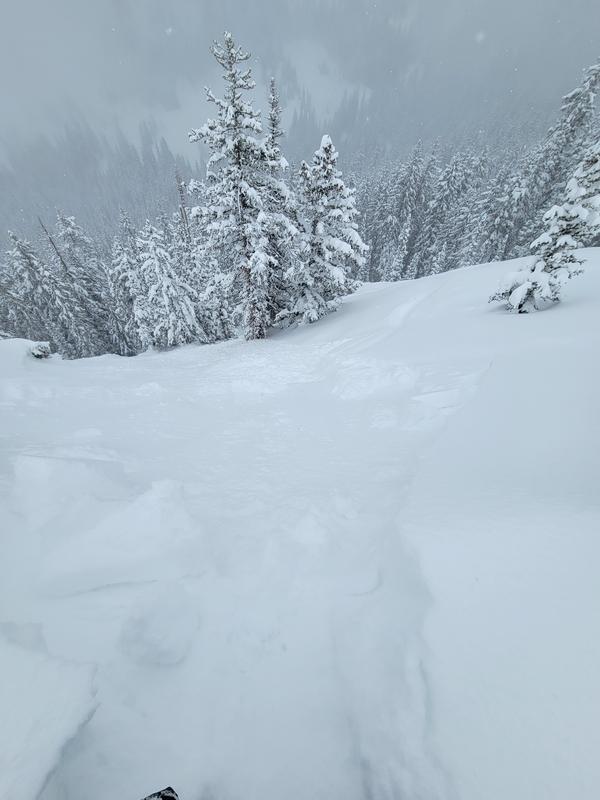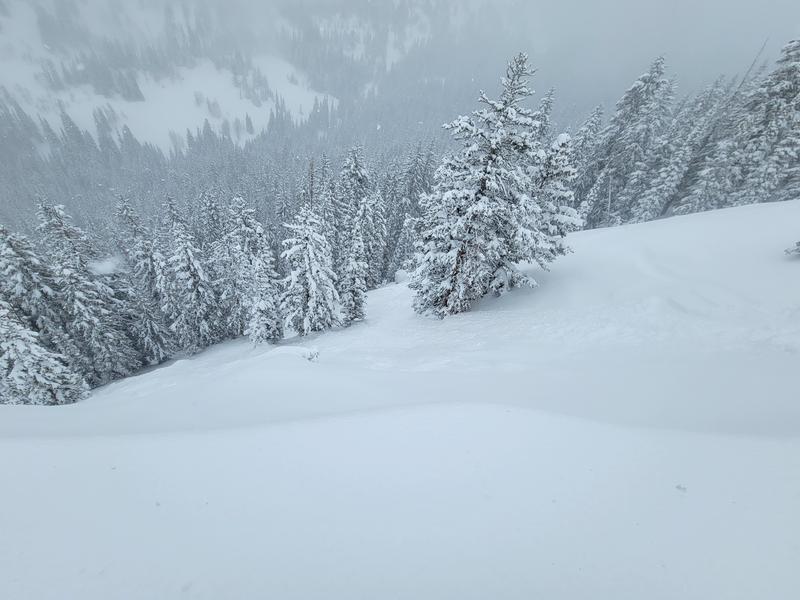 Poked over the edge with my board and the entire slope cracked and slid. This would not be fun to trigger from below as it gathered quite a bit of snow and ran through the trees about 200 to 300 feet down. ENE facing. Failed at new snow interface.