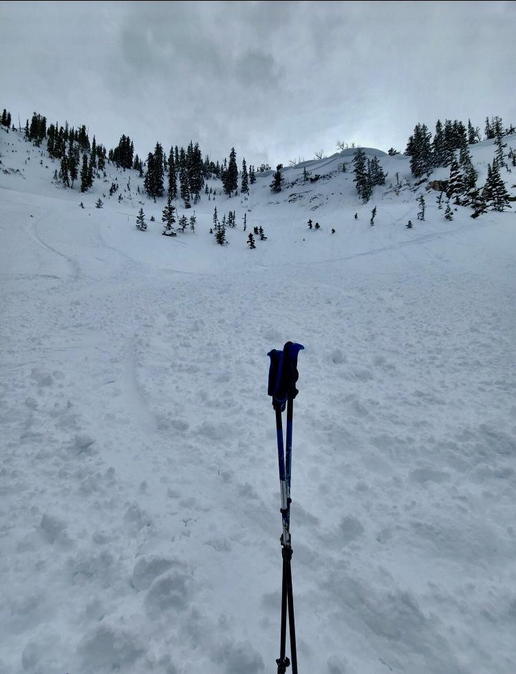 This avalanche in the Dog Lake Chutes was a skier triggered cornice that broke out 1'-3' deep x 200' wide. This avalanche ran 500' vertical before stacking debris up 8' deep on the bench below. This avalanche would be classified as a D2 (destructive size 2) which is large enough to bury, injure, or kill a person.