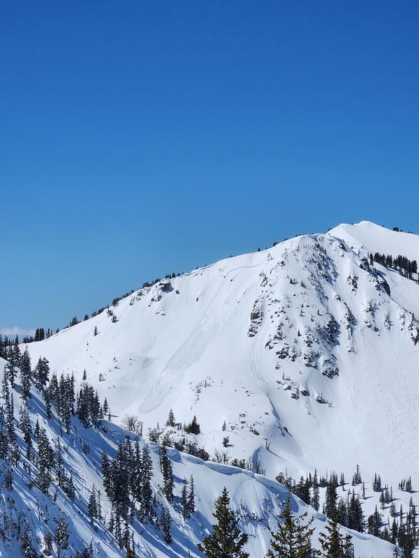 Noticed this wet slab on the SE face of Mt. Tuscarora, while ascending Pioneer Peak from Brighton. We estimated that it came down around noon. My partner and I discussed and we didn't see any discernable tracks going into the slide, but we were to far away to really assess it. I was suprised at the scale of it (maybe 80ft across and it ran 400ft). It's a good reminder to get off the solar aspects early on days like today.