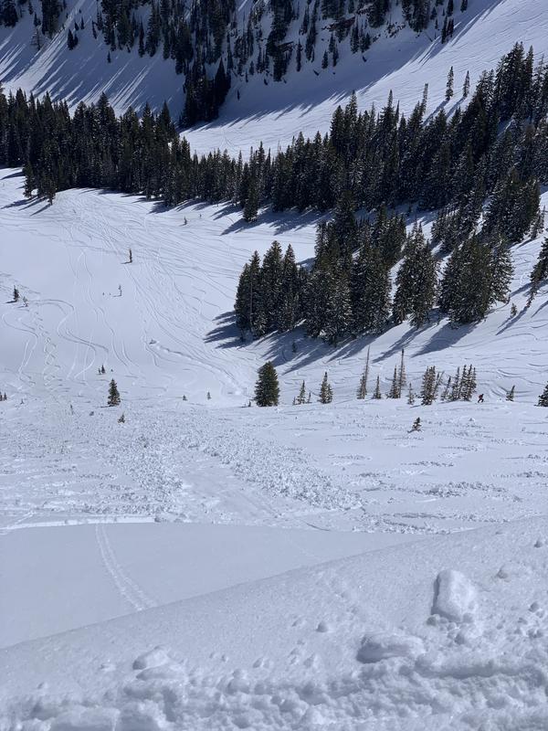 Was just getting to the top of silver with a friend when we saw a party preparing to drop towards park city despite active wet slab conditions including many rollerballs. Skier 1 in the party drops and triggered a small slow wet slide off of a wind lip which then caught and carried the skier 10 feet or so. Thankfully this one did not break bigger and thankfully did not trigger the larger cornice above. Skier 2 ski cut and did not trigger any additional slides but continued to ride the same aspect down.