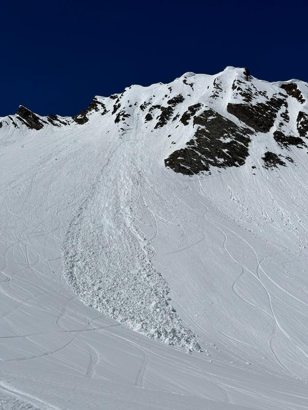 Set off a decent size wetslide on the line just south of Thunderstruck (east facing) at around 11am. Slide ripped out below my partner so he wasn't caught but rode out with it and was able to duck left away from the slide. Big enough to send you on a nasty ride especially in exposed terrain.