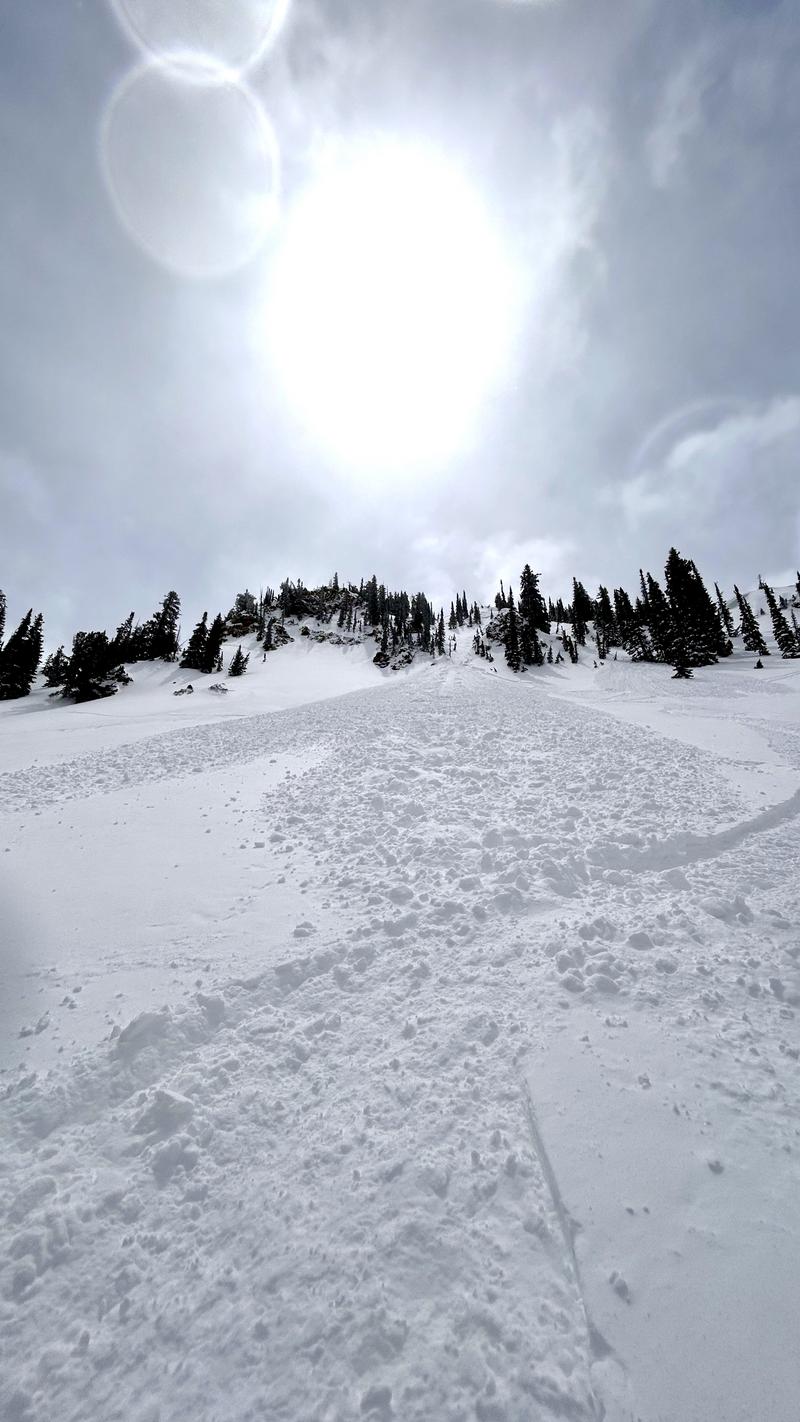 I simply made the mistake of being ignorant to the signs as I felt confident from the day before in riding the same line from the summit with endless free refills. I waited on the summit for about 10 minutes to find a break in the storm and get some decent light for the descent, but the wind did not let up very much. When I found it was my time to drop, I made a large skicut across the top of the chute and was not seeing any signs of cracking, movement, etc. I decided to ride along the spine and about 1/2 way down, I dumped into the main gut of the chute with a big turn. I was white-roomed and was forced to slow down so I didn't catch an edge/topple over, and in doing so, I was knocked from behind by my sluff, but luckily, I was to the side of the main slide pathwas barely touched by the moving snow.
