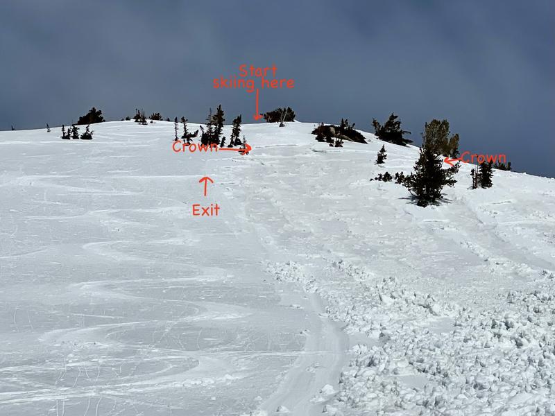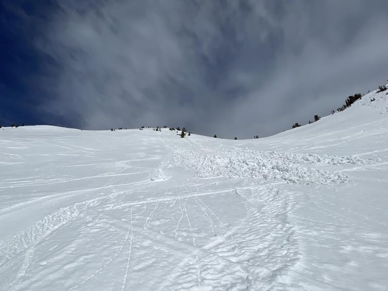 I would call this a slough, except for the fact it actually window paned on me 5 turns into my run, so technically, it was a wet slab. Slow moving, I was able to ski off of it without issue. Ran about 600 vert before coming to a stop. Left a decent pile of heavy, wet debris. Ran on the dust layer reported by UAC 5/13.