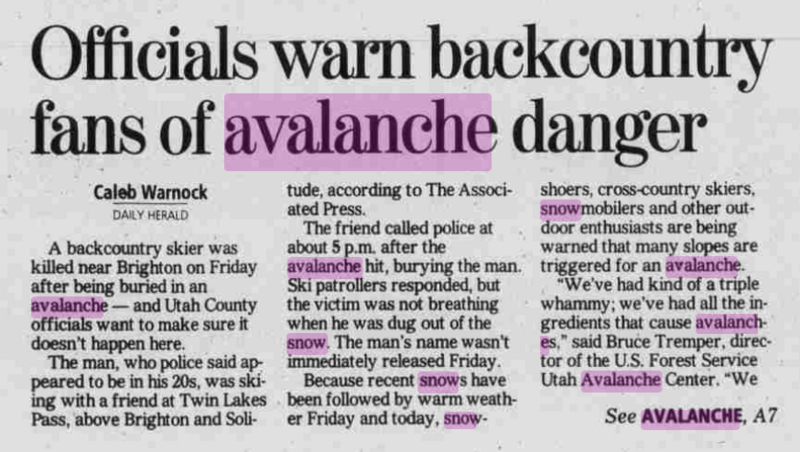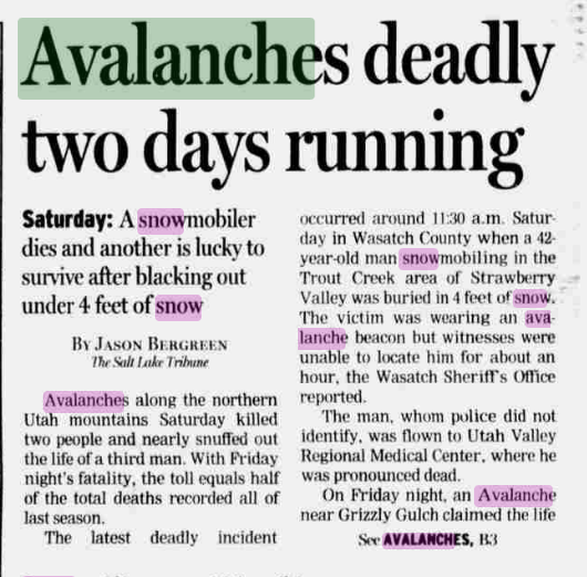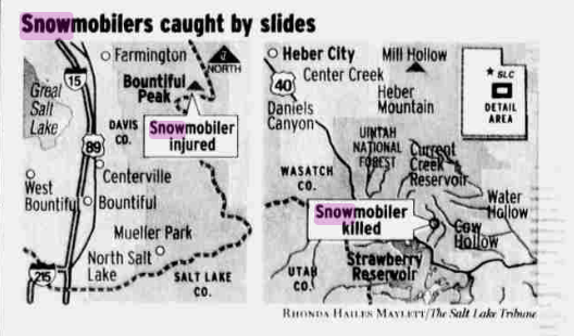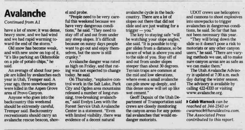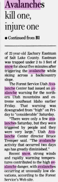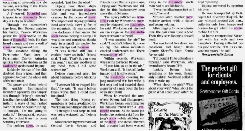 In the Bountiful Mountains, Trace DeJong, a 27 year old snowmobiler was parked at the base of a steep slope, making a video of his friend high marking above him. His friend triggered a very large avalanche, 8' deep and 200' wide. Dejong tried to start his snowmobile to get out of the way but the avalanche completely buried him after descending 800' vertical. Armed with an avalanche beacon but no shovel, his partner miraculously uncovered DeJong in under 15 minutes, not breathing but alive. A few minutes of rescue breathing brought his color back, and he was evacuated without major injuries.
