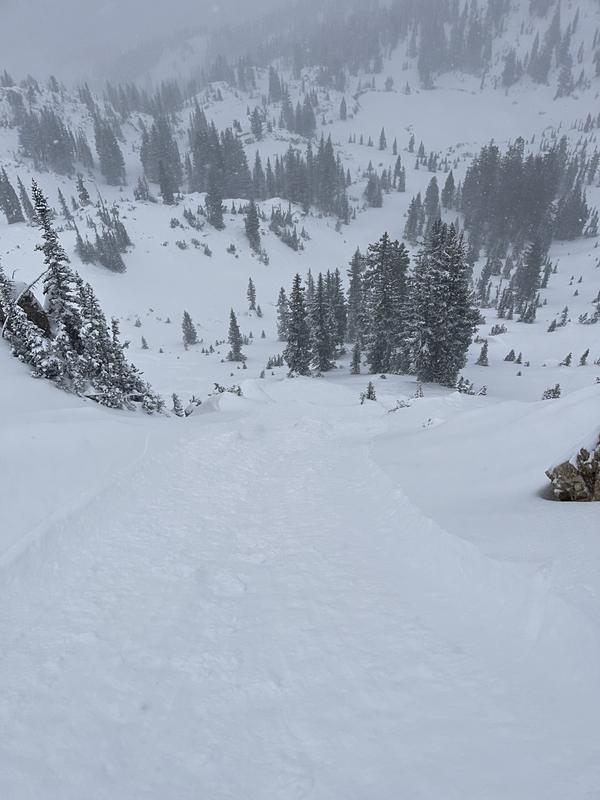 Got to the top of the 2nd chute skiers left at Rocky Point this morning after skiing another line where the snow felt stable. It was evident there was a weak layer underneath the new snow that was unstable. I was able to trigger a small slide that moved down the chute most of the way. Not big enough to bury someone but would certainly have knocked you off your feet. I belive it was likely a combination of new and wind affected snow. Be safe out there!