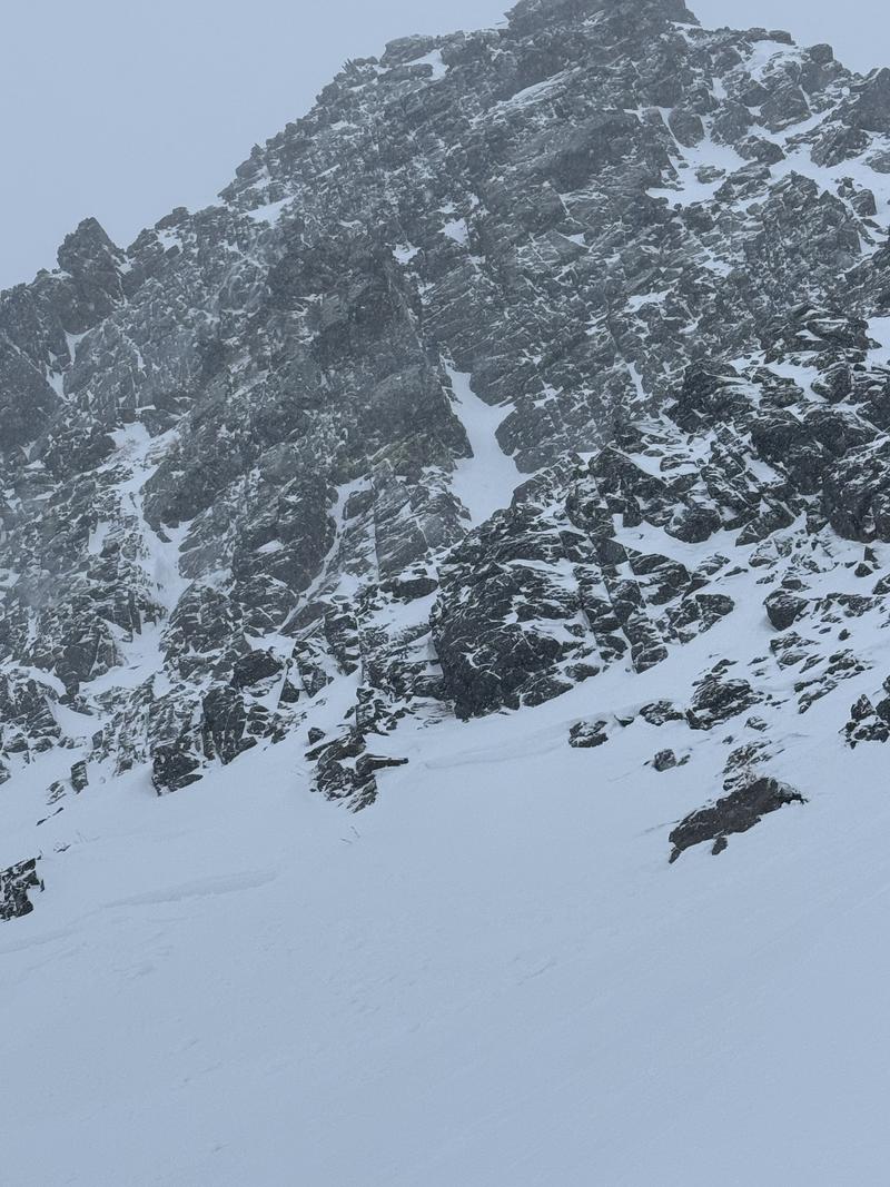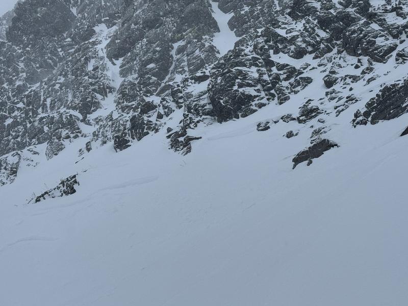 Was able to trigger this one superficial, soft slab, right along the rocks at the top of the slope, which propagated across path and ran about 40ft, but did not step down into any layers below.